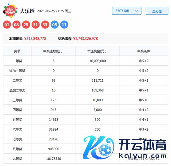 上期开奖:体彩大乐透第2025071期开奖号码为:01 08 25 31 33 + 05 11。