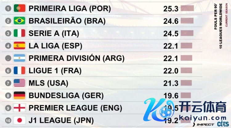 10月13日讯 CIES足球天文台统计了人人联赛每90分钟犯规情况,其中葡超以25.3次犯规位居榜首,巴甲则以24.6位居次席。