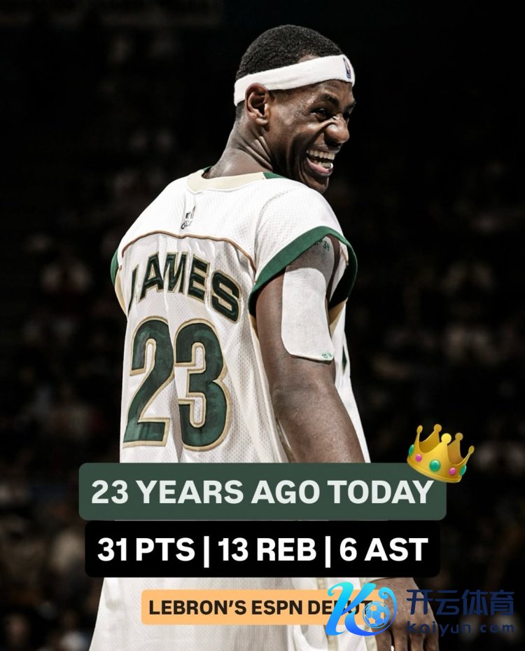 ESPN发帖追思23年前的今天,詹姆斯的高中比赛初次通过ESPN进行全好意思直播,而詹姆斯打出31分13篮板6助攻的精彩进展率队取胜。
