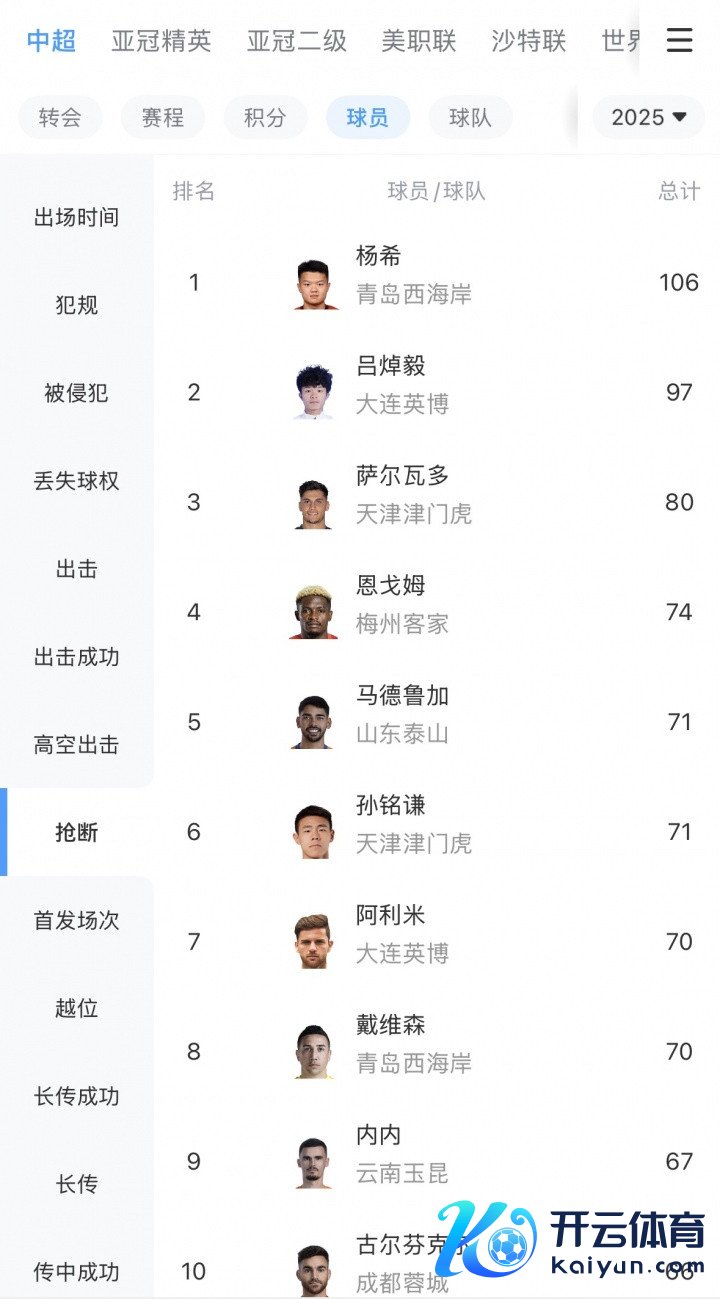 本届U23亚洲杯,杨希抢断数15次排在第二,而在上赛季中超,杨希以106次抢断排在中超第一。