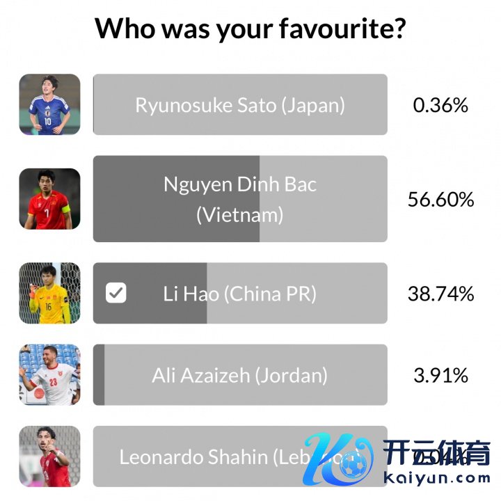 适度当今,李昊取得38.74%的票数,逾期于越南U23的阮庭北,暂居第二。