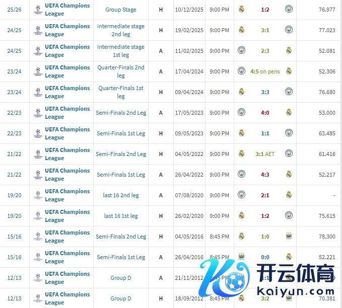 皇马与曼城交手记载: