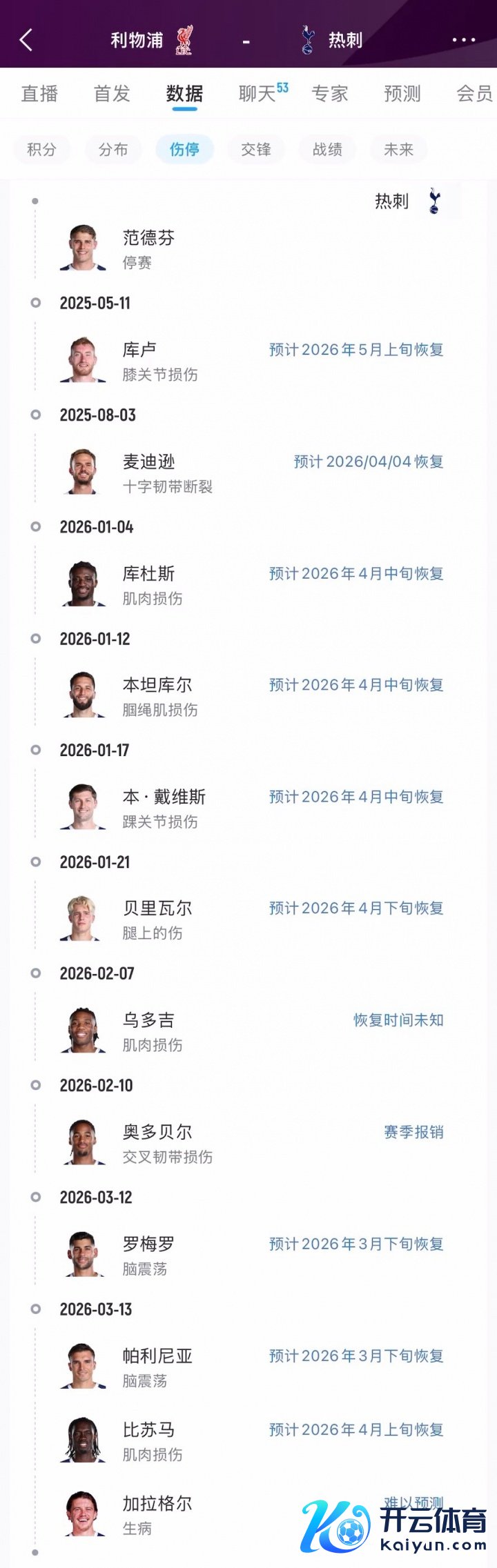 热刺主帅图多尔在赛前阐述了新的伤停东说念主员,罗梅罗和帕利尼亚均因脑颠簸保护时势而无缘本场比赛,范德文被停赛,比苏马肌肉受伤,还有多名恒久伤号。