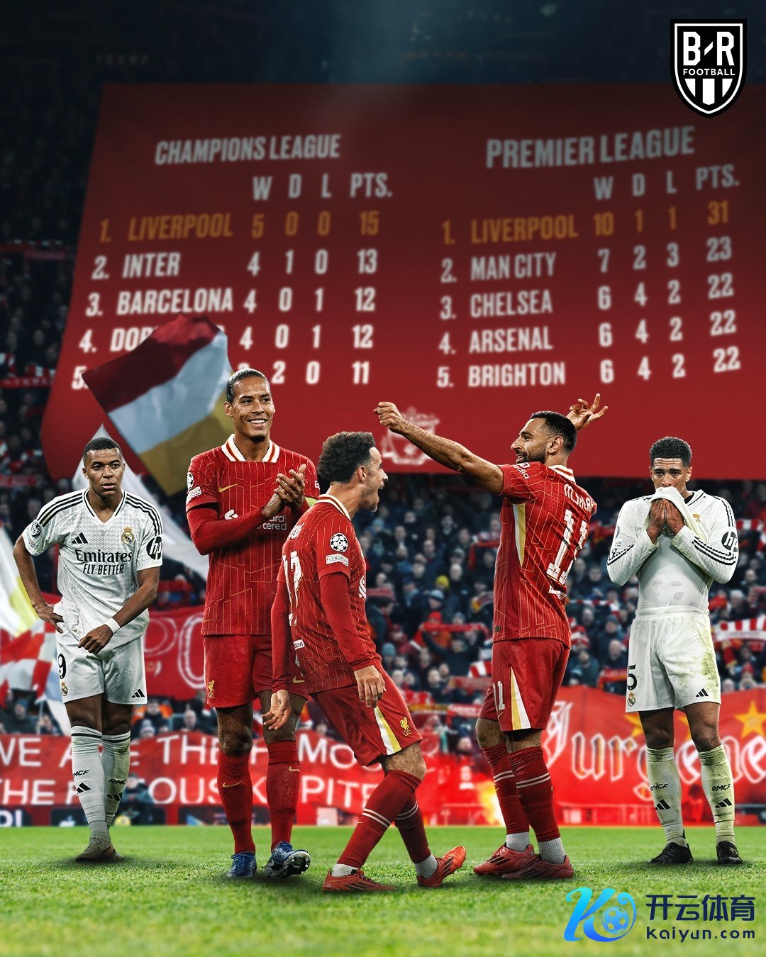 欧冠联赛阶段第5轮,利物浦2-0皇马,姆巴佩、萨拉赫失点,加克波、麦卡利斯特破门。