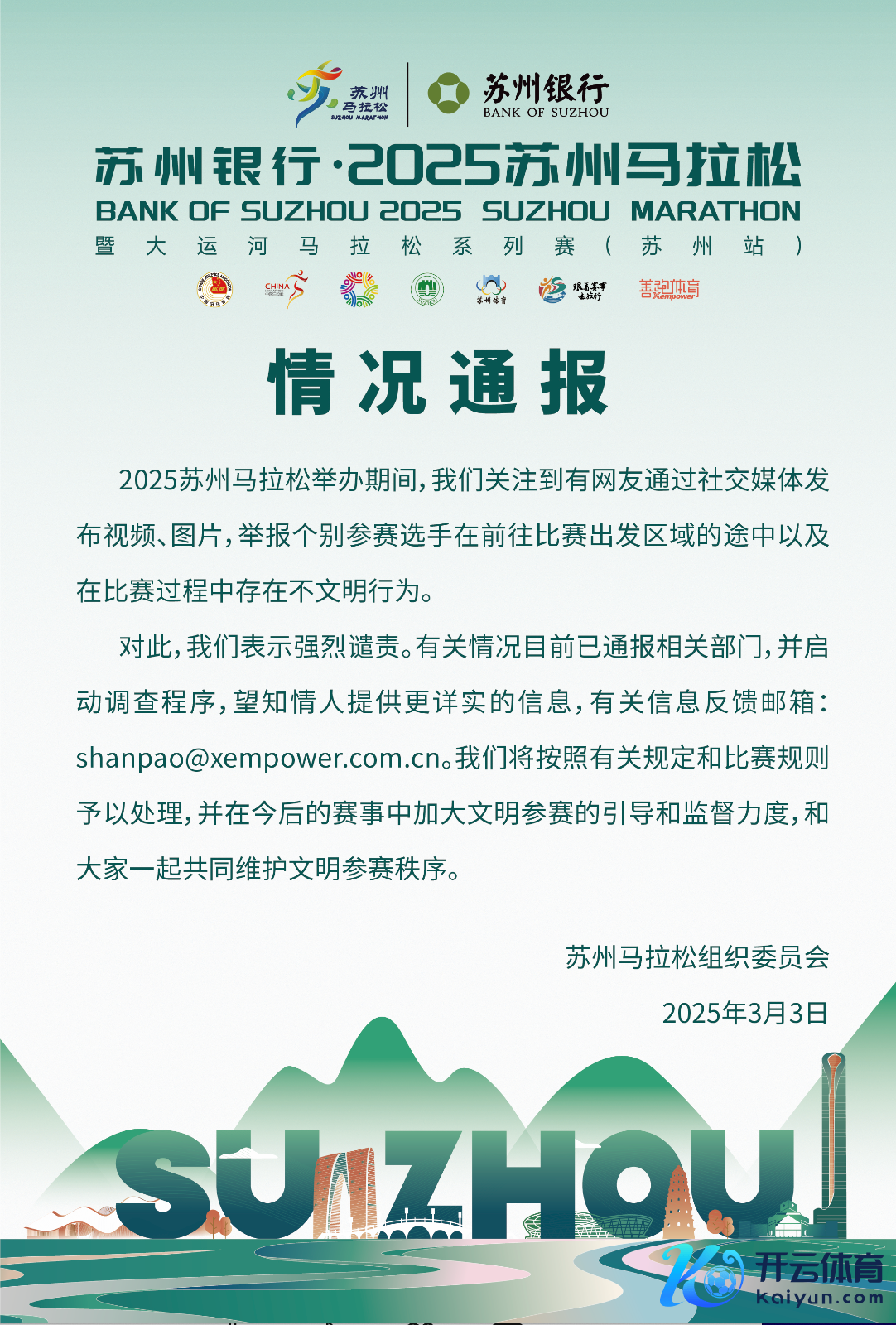 3月3日,苏州马拉松组委会就网传“多名跑者在推行中学校门处小便”发布情况通报称,2025苏州马拉松举办时间,咱们柔软到有网友通过酬酢媒体发布视频、图片,举报个别参赛选手在赶赴比赛启航区域的途中以及在比赛经过中存在不闲雅活动。对此,咱们暗示激烈降低。联系情况现在已通报联系部门G买球网体育信息,并运行看望智商。