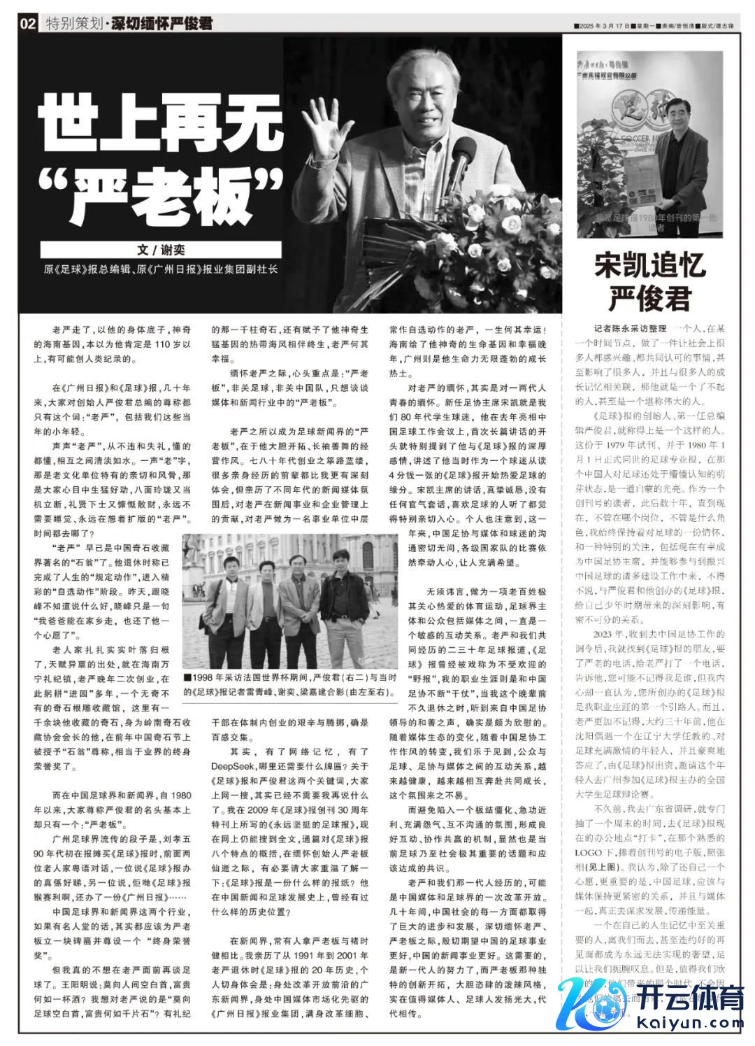 其实,有了收罗驰念,有了DeepSeek,那儿还需要什么牌匾?对于《足球》报和严俊君这两个要津词,群众上网一搜,其实照旧不需要我再说什么了。我在2009年《足球》报创刊30周年特刊上所写的《恒久坚挺的足球报》,当今网上仍能搜到全文,通篇对《足球》报八个特质的抽象,在记念独创东谈主严雇主仙逝之际,有必要请群众重温了解一下:《足球》报是一份什么样的报纸?他在中国新闻和足球发展史上,也曾有过什么样的历史位置?(附《恒久坚挺的足球报》一文络续,阅读请点击文末阅读原文)