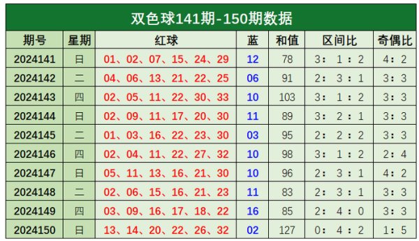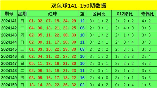 双色球第2024150开奖奖号:红球13、14、20、22、26、32G买球网体育信息,蓝球02。红球和值为127,区间比为0:4:2,奇偶比为1:5。蓝球开出02。 红球轮廓分析: 奇偶比分析: 上期开出红球奇数13,偶数14、20、22、26、32,奇偶比为1:5,近10期奇偶比为29:31,偶数号码走势较高,本期预测奇数号码出号较热,保举奇偶比为4:2...