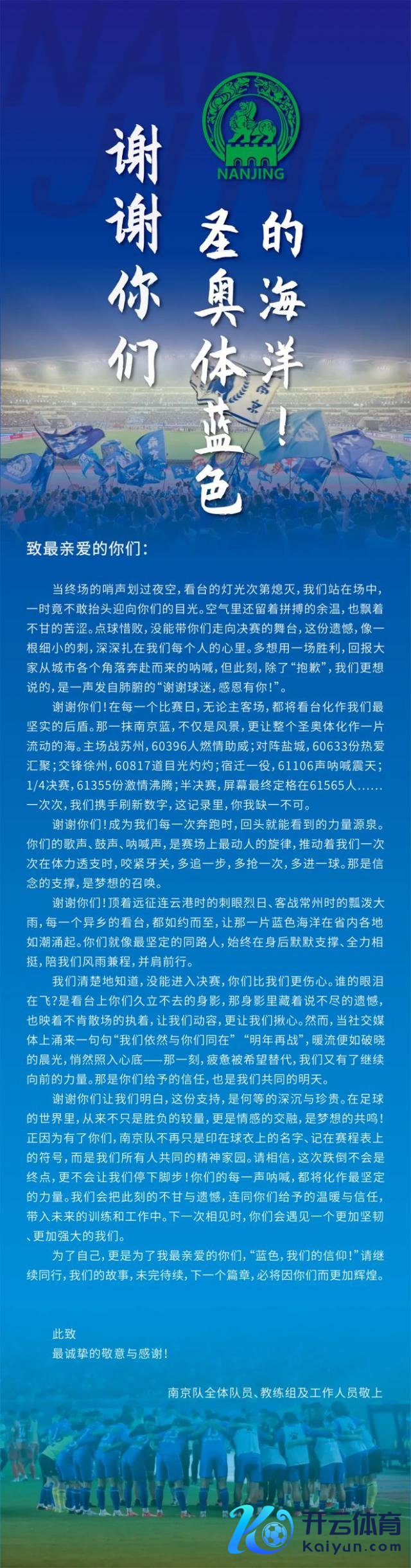 雷速体育 10 月 23 日讯 苏超半决赛,南京队流程点球大战不敌泰州队,最终无缘决赛。赛后,南京队向球迷发表了一封感谢信。