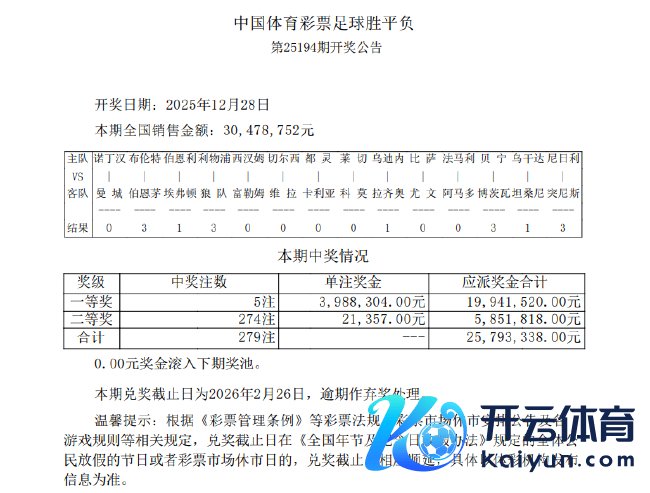 北京时辰12月28日,足彩第25194期开奖后果揭晓。本期十四场一等奖开出5注,单注奖金3,988,304元,628万滚存被清空;二等奖开出274注,单注奖金21,357元;任选九场开出1,757注,单注奖金7,696元。本期输赢彩销量为30,478,752元,任九投注总和为21,130,028元。