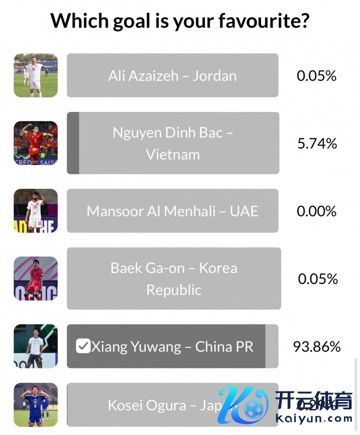 当今在评比中,向余望获取的球迷得票率为93.86%,越南球员阮庭北的进球则位列第二,占比5.74%。