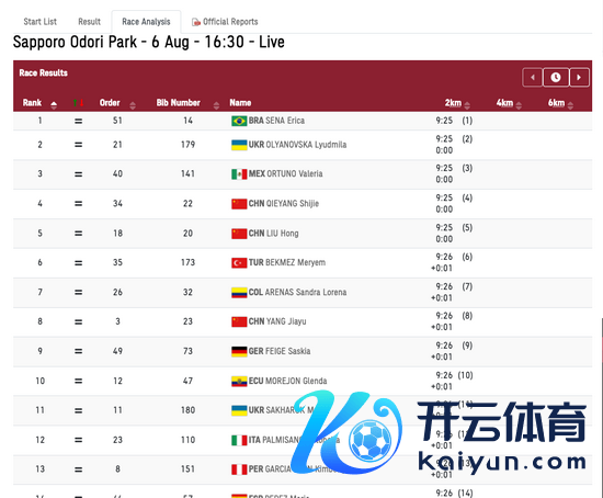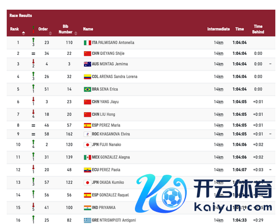 最终体育集锦,意大利选手帕尔米萨诺以1小时29分12秒赢得冠军,正本第三的巴西选手在终末阶段被罚,刘虹卓著她后,以1小时29分57秒赢得一枚铜牌,切阳什姐赢得了第7,杨家玉被罚2分钟也曾赢得第12。