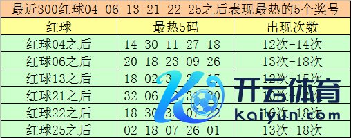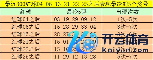 红球冷码统计:双色球第2024142期开出红球奖号分手为:04、06、13、21、22、25,在最近300期开奖中,各号码出现之后其下期出现最少的5个红球分手为: