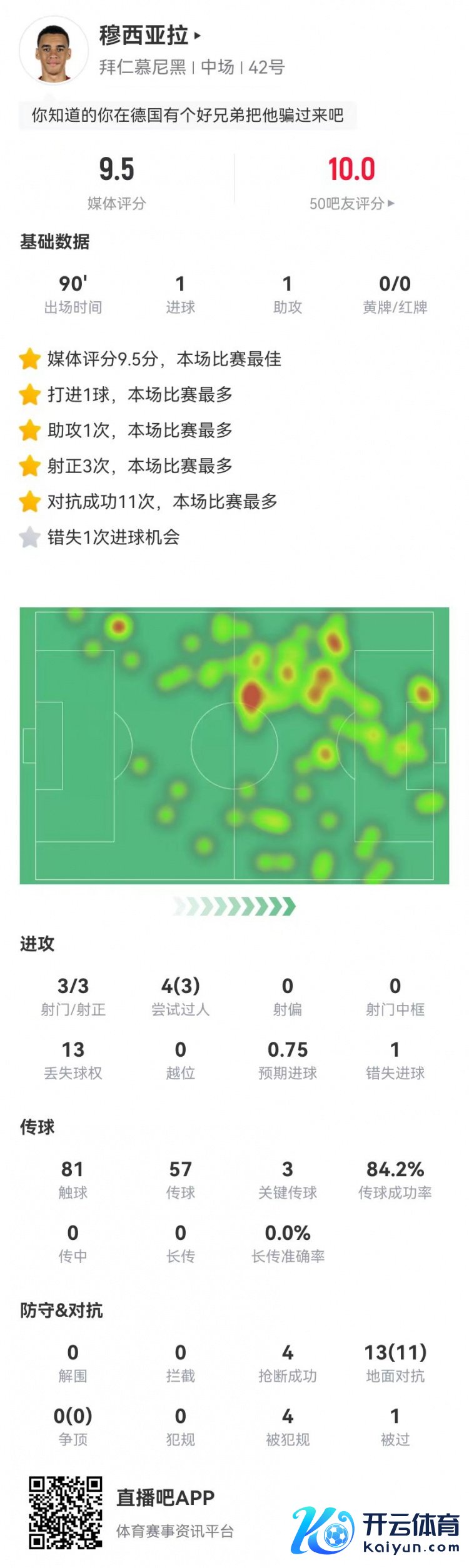 12月21日讯 拜仁在本轮德甲5-1大捷莱比锡,穆西亚拉本场数据如下: