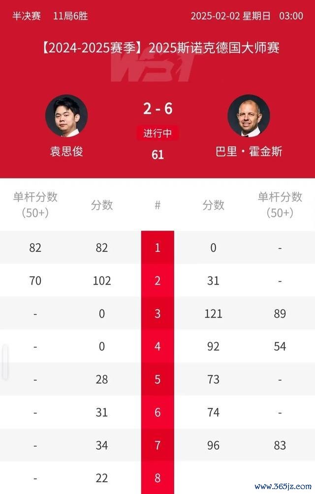 从第三局运行,霍金斯十足掌控了比赛,打出89、54、83、83四杆50+连胜六局,6-2削弱胜出,袁念念俊毫无拦阻之力!