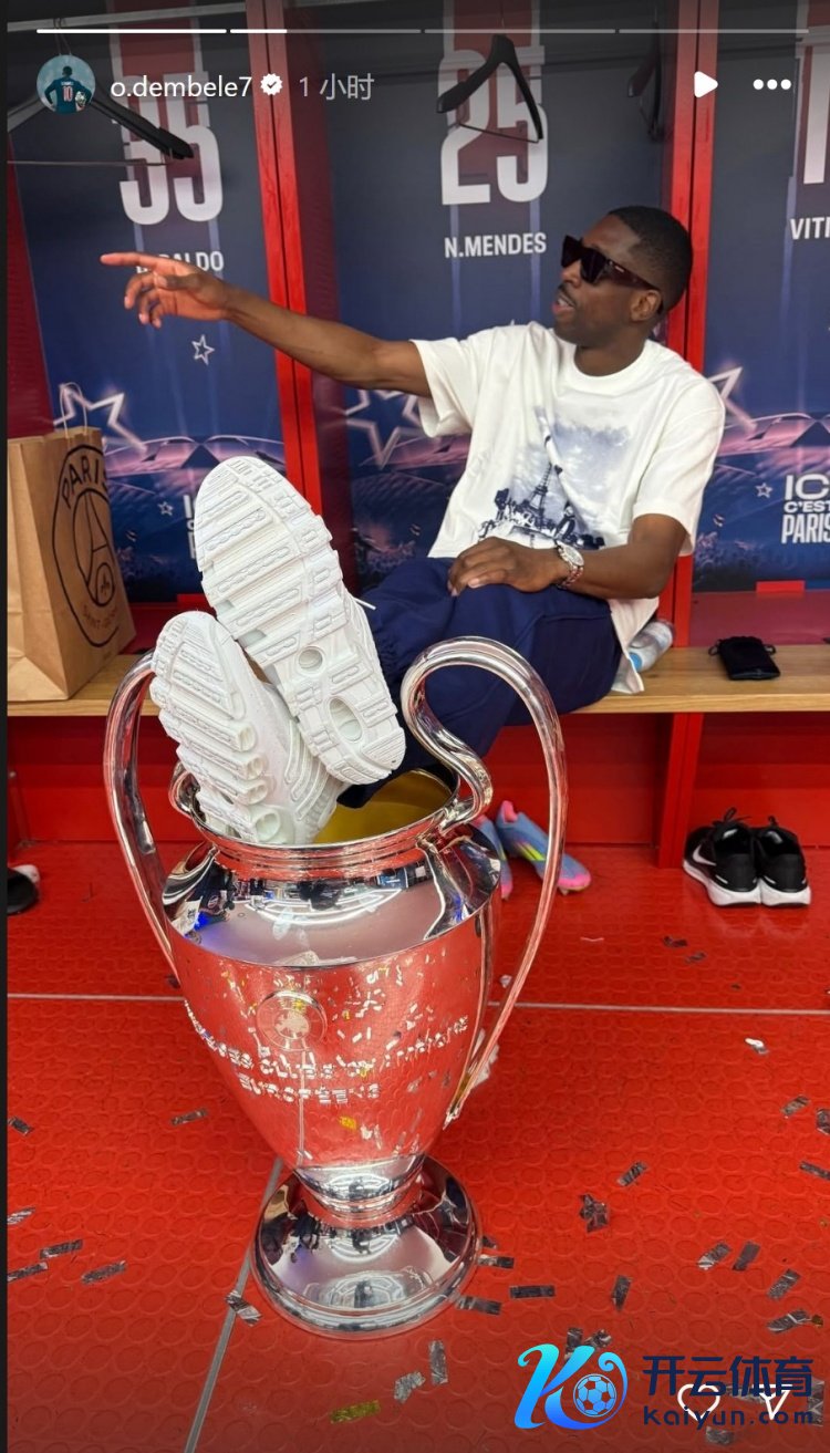 登贝莱本赛季推崇特等出色体育录像/图片,成为金球奖的热点东说念主选,赛后他在搪塞媒体上晒出将脚搭在欧冠奖杯上的像片,庆祝球队夺冠。