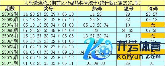 前区温码判断:在大乐透第2025071期开奖之后,前区当今有13个遗漏值4-9之间的温码,温码遗漏散播为:号码10 12 21遗漏值为4期、号码18 27 28遗漏值为5期、号码32 35遗漏值为6期、号码05遗漏值为7期、号码26 29遗漏值为8期、号码14遗漏值为9期。