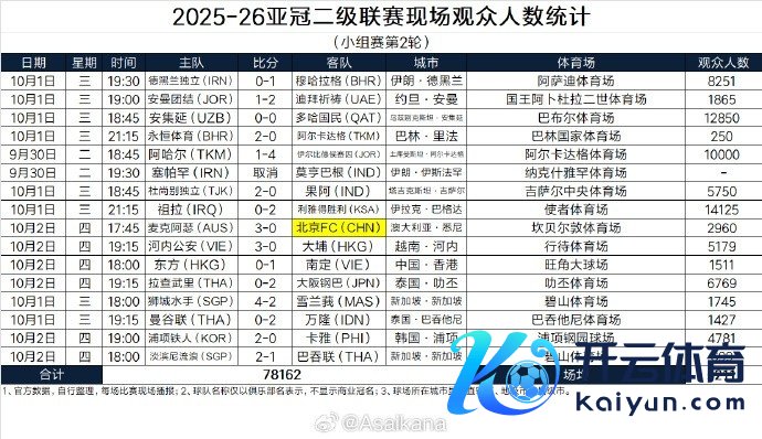 2025-26亚冠二级联赛现场不雅世东说念主数统计(小组赛第2轮)体育录像/图片