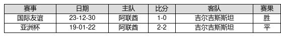 阿联酋 VS 吉尔吉斯斯坦两队近10年的交战次数为2场,阿联酋1胜1平0负,赢球概率为50.0%,平局概率为50.0%,输球概率为0.0%。