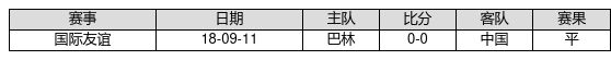 巴林 VS 中国两队近10年的交战次数为1场,巴林0胜1平0负,赢球概率为0.0%,平局概率为100.0%,输球概率为0.0%。