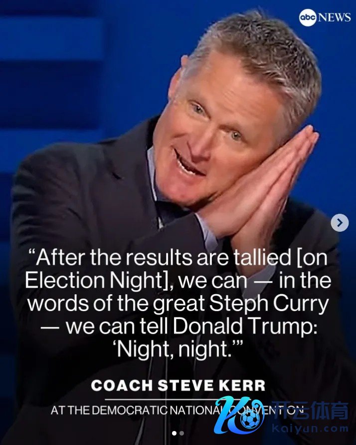 本年8月,科尔受邀在民主党世界代表大会演出讲,称特朗普会输掉大选,同期师法了弟子库里知名的“晚安”手势,这个动作赢得了浓烈的掌声,并在酬酢媒体上疯传。