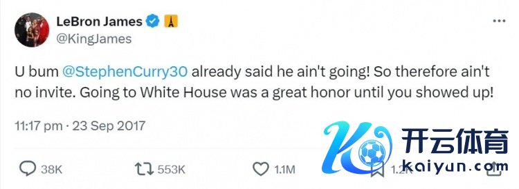 詹姆斯和特朗普的梁子越结越深。2017年硬人夺冠,史蒂芬-库里表态不思走访白宫,特朗普干脆恐慌了对冠队列的邀请。詹姆斯在酬酢媒体上径直贴脸开大:“你这个笨蛋,库里也曾说不会去,就别扯什么邀请了。在你出现之前,走访白宫是我莫大的庆幸。”这条推特最终获取119万次点赞和55万次转发,是当年最受迎接的畅通员推文。