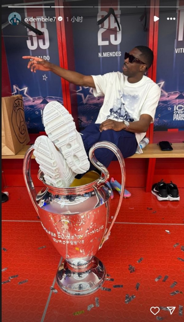 6月1日讯 欧冠决赛,登贝莱助攻双响,巴黎5-0大捷国米,捧起欧冠奖杯。 登贝莱本赛季推崇特等出色体育录像/图片,成为金球奖的热点东说念主选,赛后他在搪塞媒体上晒出将脚搭在欧冠奖杯上的像片,庆祝球队夺冠。...