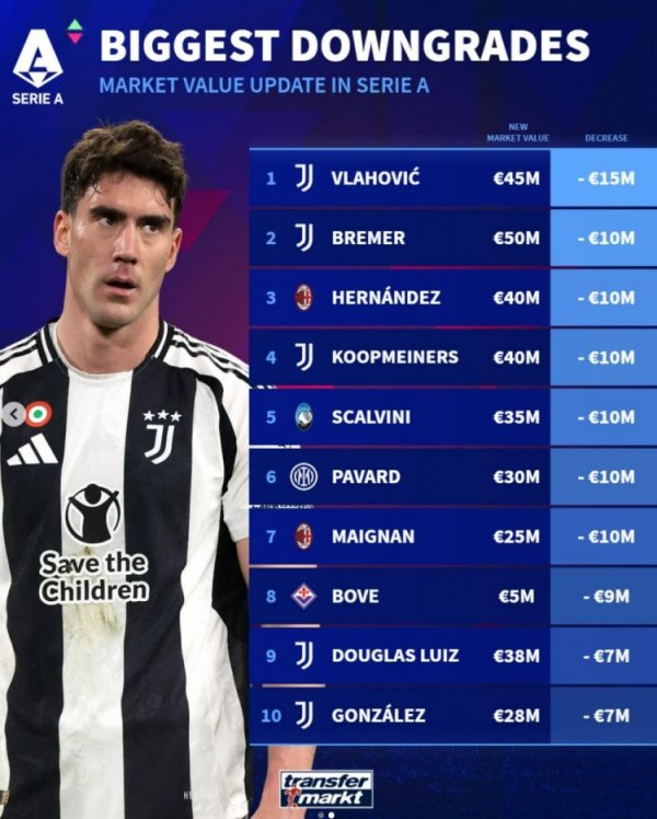 体育录像/图片 3月30日讯 德转此前更新了意甲球员身价,并清点了这次更新身价下落最多的前十榜单,其中弗拉霍维奇居首,尤文球员在前十中占据5席,具体球员现在身价以及跌幅如下: 1、弗拉霍维奇(尤文,4500万欧)-1500万欧 2、布雷默(尤文,5000万欧)-1000万欧 3、特奥(AC米兰,4000万欧)-1000万欧 4、库普梅纳斯(尤文,4000万欧...