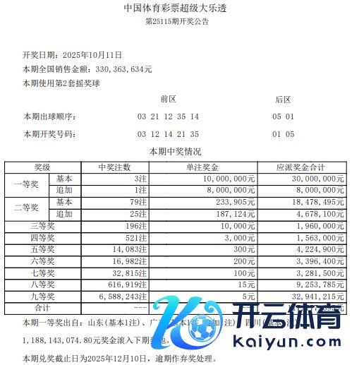 本期世界销量为3.3亿元,奖池方面,11.88亿余元滚存至10月13日(周一)开奖的第25116期。