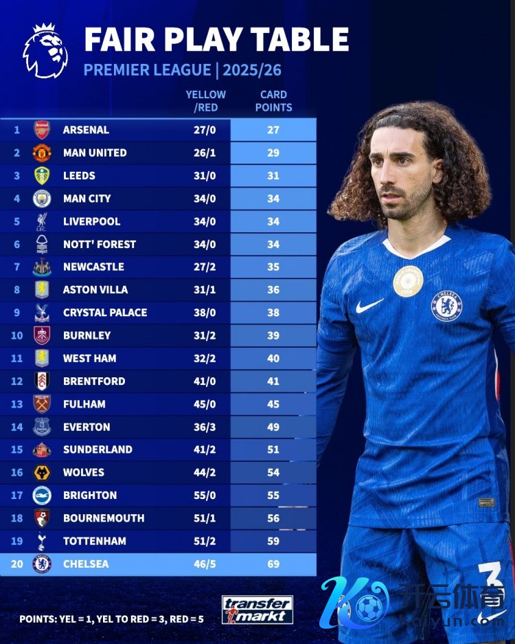 1月8日讯 德国转会阛阓统计了本赛季各队在英超吃牌的积分,并排出名次,阿森纳27分最少,切尔西69分最多。