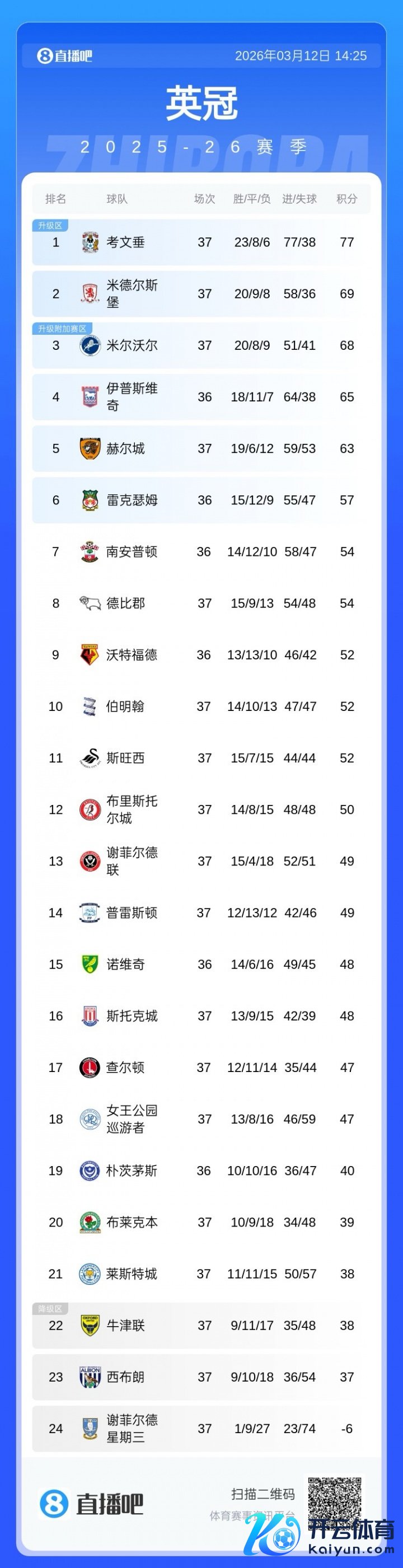 现在在英冠最新积分榜上,考文垂77分和米德尔斯堡69分排在前二,米尔沃尔、伊普斯维奇、赫尔城和雷克瑟姆排在升级附加赛区的3-6名。第6的雷克瑟姆与死后球队的分差莫得很大,多队不错冲击附加赛区。