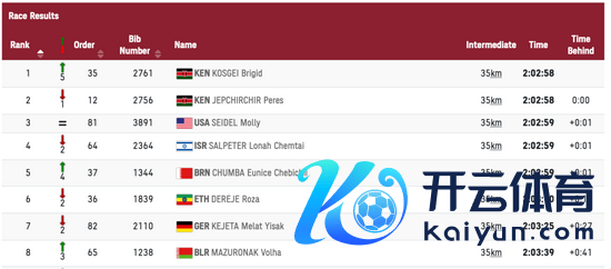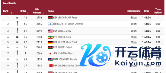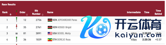 科斯盖赢得银牌,得益为2小时27分36秒。塞德尔赢得第三,得益为2小时27分46秒,继里约的鲁普后,好意思国马拉松再获一枚铜牌。日本选手一山麻绪赢得第八,得益为2小时30分13秒。