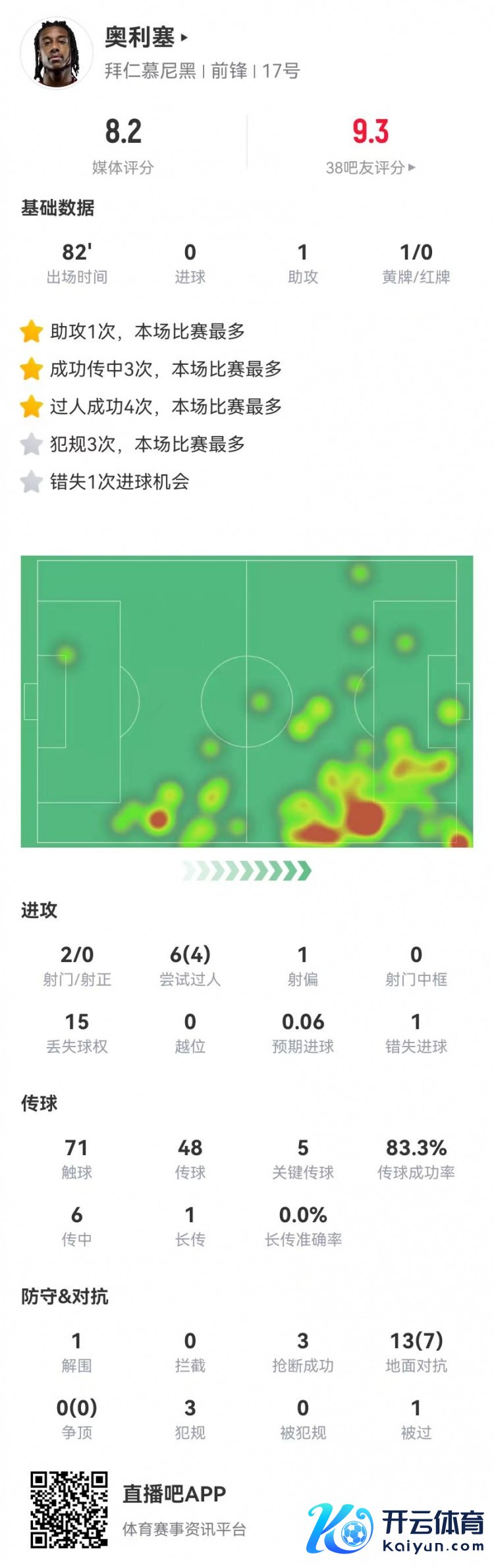 12月21日讯 拜仁在本轮德甲5-1大捷莱比锡,奥利塞本场数据如下: