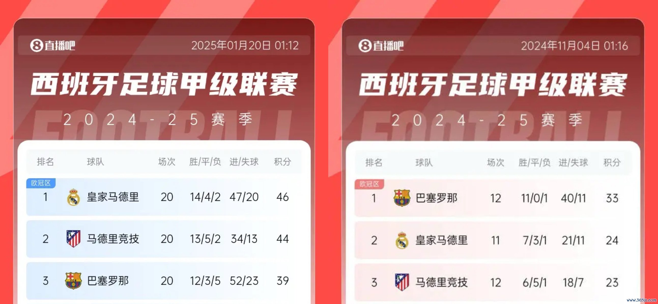 随后3队各赛8场体育赛事直播,时事发生大逆转。马竞这8场拿到21分仅丢3分,20轮积44分;皇马这9场(补赛一场)拿到22分,2分上风登顶领跑;巴萨这8场仅得6分,打到第20轮过期马竞5分、过期皇马7分。