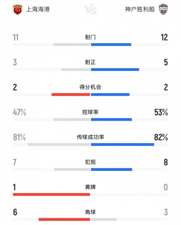 两队全场数据对比如下(主队上海海港在前):射门数:11-12射正数:3-5得分契机:2-2控球率:47%-53%传球到手率:81%-82%犯规数:7-8黄牌数:1-0角球数:6-3 体育赛事直播